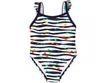 Dívčí jednodílné pruhované plavky s rybičkami.