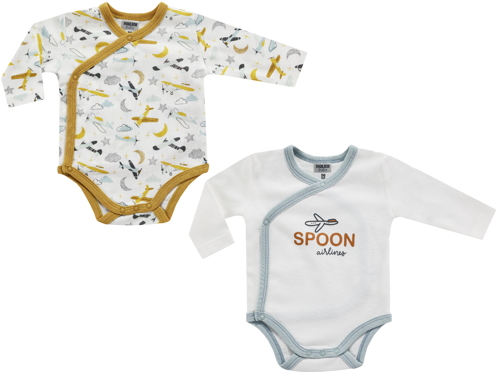 Krásný set 2 bodýček z vysoce kvalitní bavlny. Krásná barevná kombinace s motivy letadel. Praktické zapínání na druky, zavinovací systém umožňuje vyhnout se oblékání přes hlavičku.