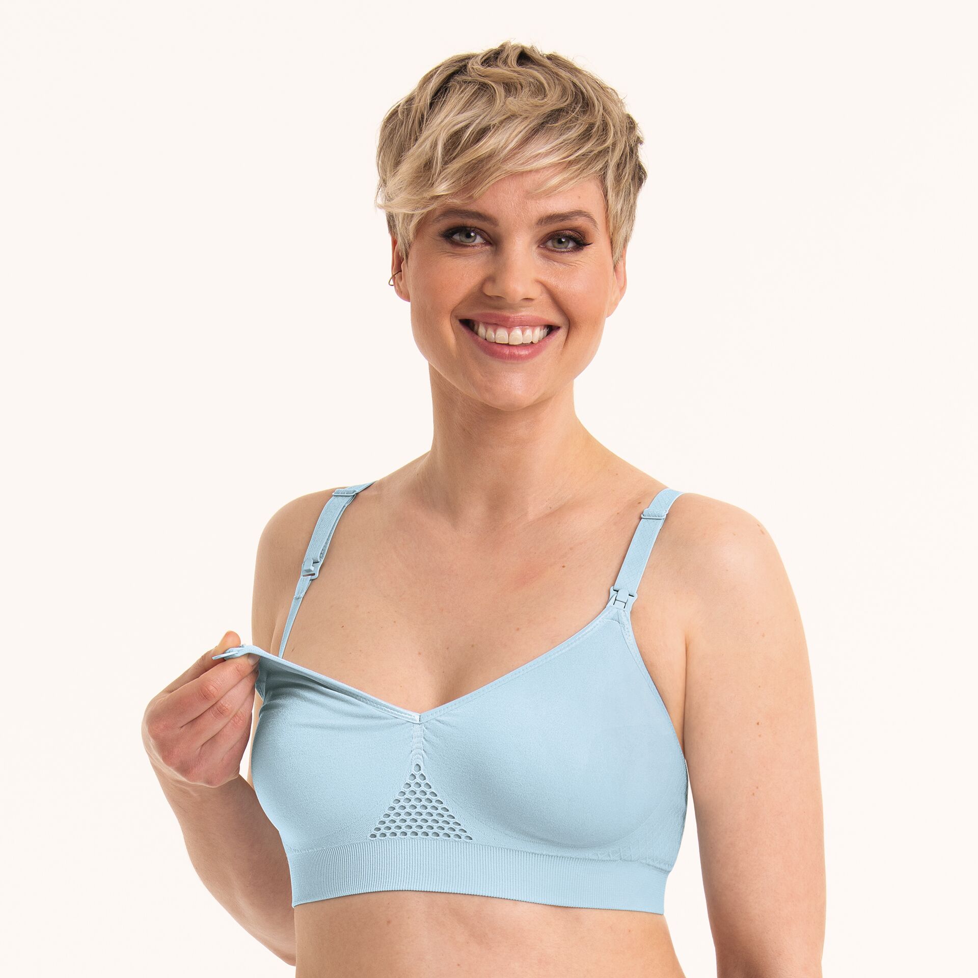 Tato kojicí podprsenka má dvouvrstvé měkké košíčky, dokáží perfektně ukrýt ochranné hygienické tamponky, takže ty jsou v podprsence zcela neviditelné. Velmi příjemný pocit při nošení zajišťuje hedvábně jemné a elastické mikrovlákno s lehkým leskem. V přední středové části vplétané vzdušné zóny. Košíčky lze hluboce otevřít a tím je děťátku při kojení umožněn ještě lepší a pohodlnější přístup k prsům.
