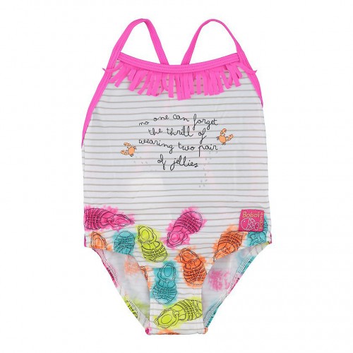 Pruhované jednodílné plavky s obrázky sandálek, které jsou vyplněny barevnými flíčky. Zepředu je na prsní části text a lem zdoben třásněmi, vzadu jsou ramínka překřížena, odhalují celá záda a lem "kalhotek" je zdoben také třásněmi.