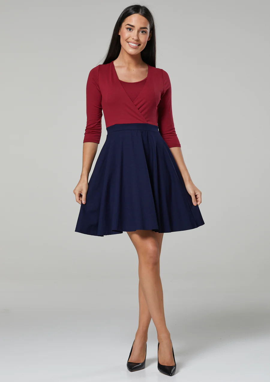 Skvělé těhotenské šaty v moderním designu s překříženým výstřihem a úchvatné dvoubarevné kombinaci. Střih je uzpůsobený na kojení, takže šaty využijete ještě dlouho po porodu. Šaty mají lichotivý střih k postavě a hezky sedí. Volná spodní sukně bude pěkně sedět na bříšku po celé těhotenství, po porodu naopak bude příjemně splývat.