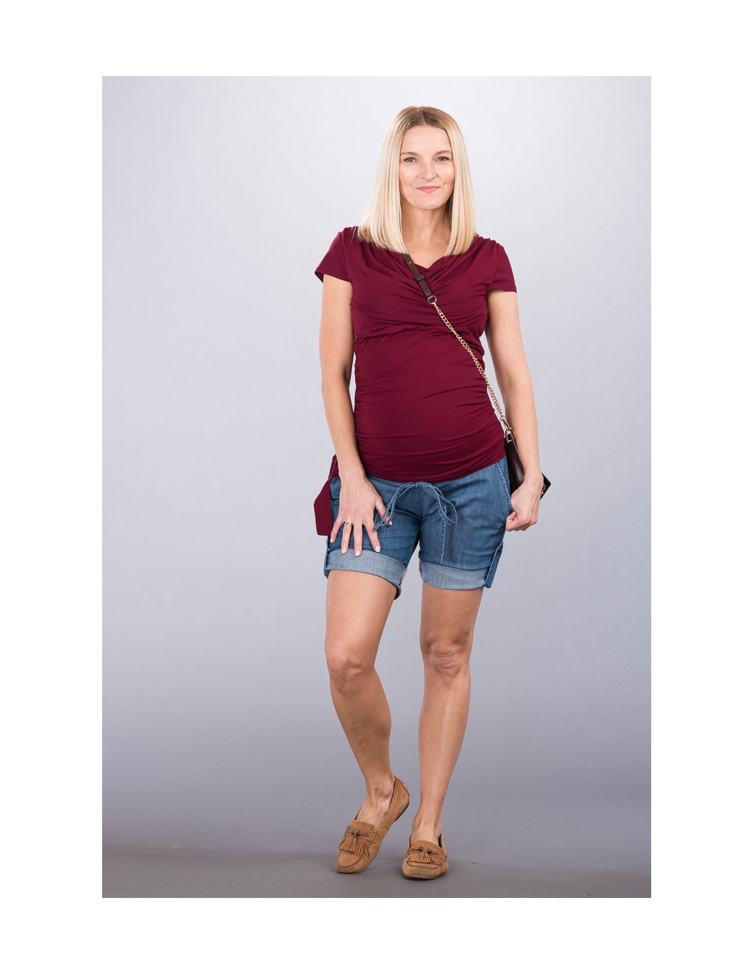 Těhotenské kraťasy pro volný čas. Oblíbené šortky z tenké vzdušné rifloviny s elastickým pásem přes bříško, díky kterému se bude cítit pohodlně od prvního měsíce těhotenství do porodu. Moderní vzhled, díky propracovanému detailu lze nohavice ještě ohrnout a zkrátit. V pase je šnůrka na stažení.